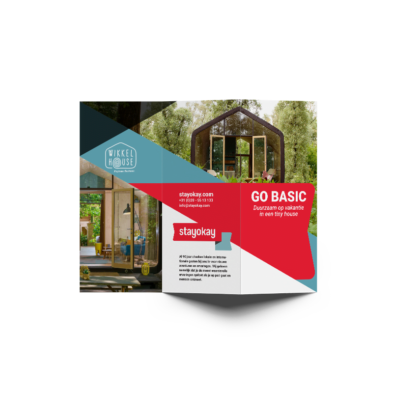 Dit werd mij gevraagd om te doen. Maak een creatieve folder die past bij de huisstijl van StayOkay en geef informatie over de nieuwe Wikkelhouses. “Hoe dan?” is dan de vraag. Alle informatie heb ik uitgezocht en meegenomen bij het ontwerpen van een mooie folder. Natuurlijk ben ik eerst begonnen met een onderzoek naar hun huisstijl, welke kleuren, wat voor type foto’s, in het kort welk gevoel moet ik creëren. Naar al het gefriemel en gefreubel ben ik op een folder gekomen die je op een natuurlijke manier de weg leidt tot de informatie.